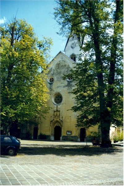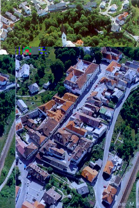 Stari del mesta s cerkvijo, graščino in hišami, ki so razporejene