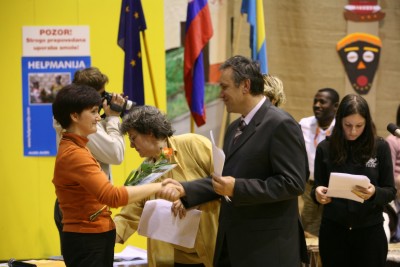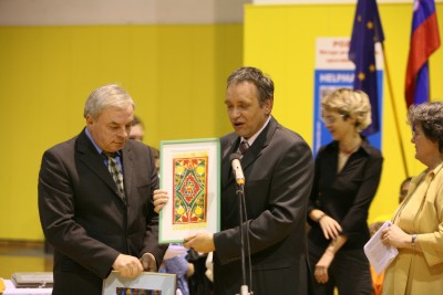 | Peter Tratnik prejema zahvalo Unicefa iz ambasadorskih rok. |
