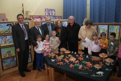 | Nepozabno slikanje v »Afriki« prvošolcev. Prijetno vzdušje se kar vidi na obrazih g. župana, ravnatelja in ambasadorjev. |