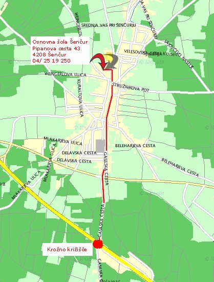 na prvem krožnem križišču zavijete desno v Šenčur.