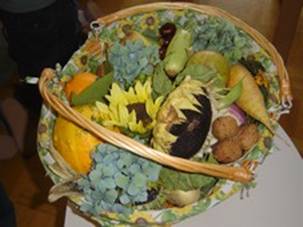 bila pestra zbirka sadja in plodov, ki rastejo na polju in v gozdu. V košari je bilo tudi nekaj jesenskega cvetja. |
