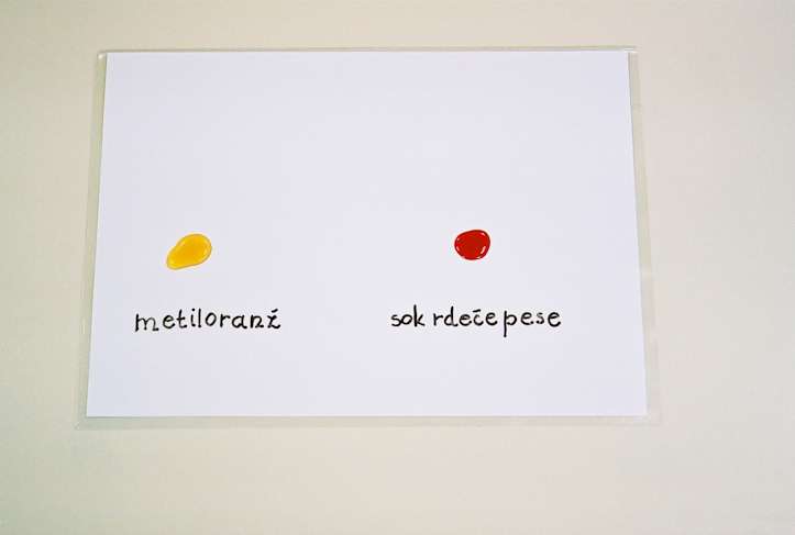 Barvne odtenke barvila rdeče pese v različno kislih ali bazičnih okoljih smo beležili in fotografirali. S pomočjo barvnega pH metra smo pripravili lestvico barvnih sprememb.