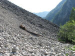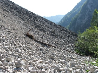 ko pobočje razpada in se material premika pod vplivom sile teže.