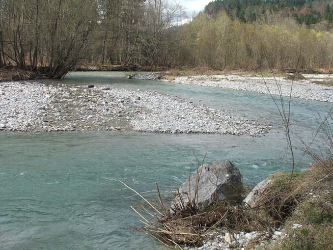 Bistrica se izliva v Savo iz leve strani. Na desni strani reke so drevesa in