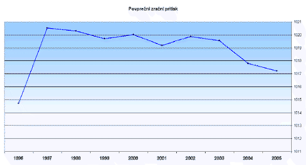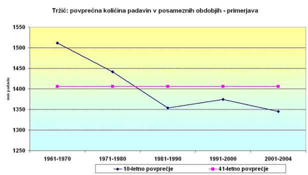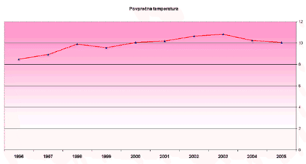 Iz zgornjega grafa o povprečni temperaturi v Tržiču od leta 1996 do 2005 je