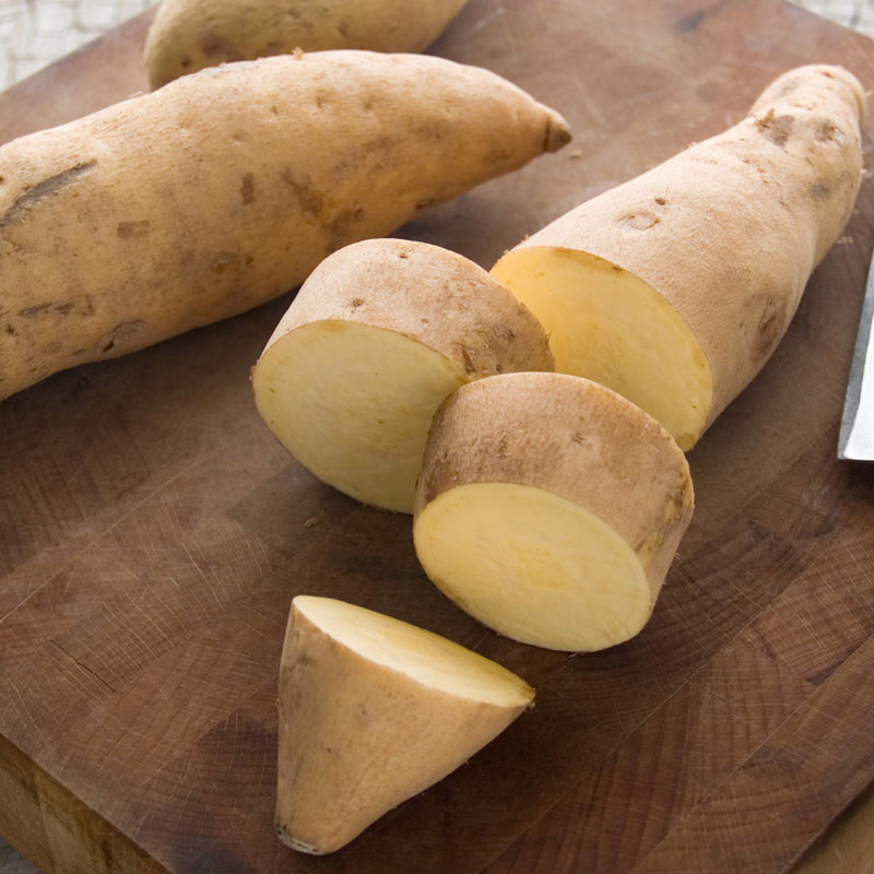 Japanese Sweet Potato.This variety has a pink to purple skin with white flesh. Its flavor is sweet and nutty. They can be grilled, steamed or baked.