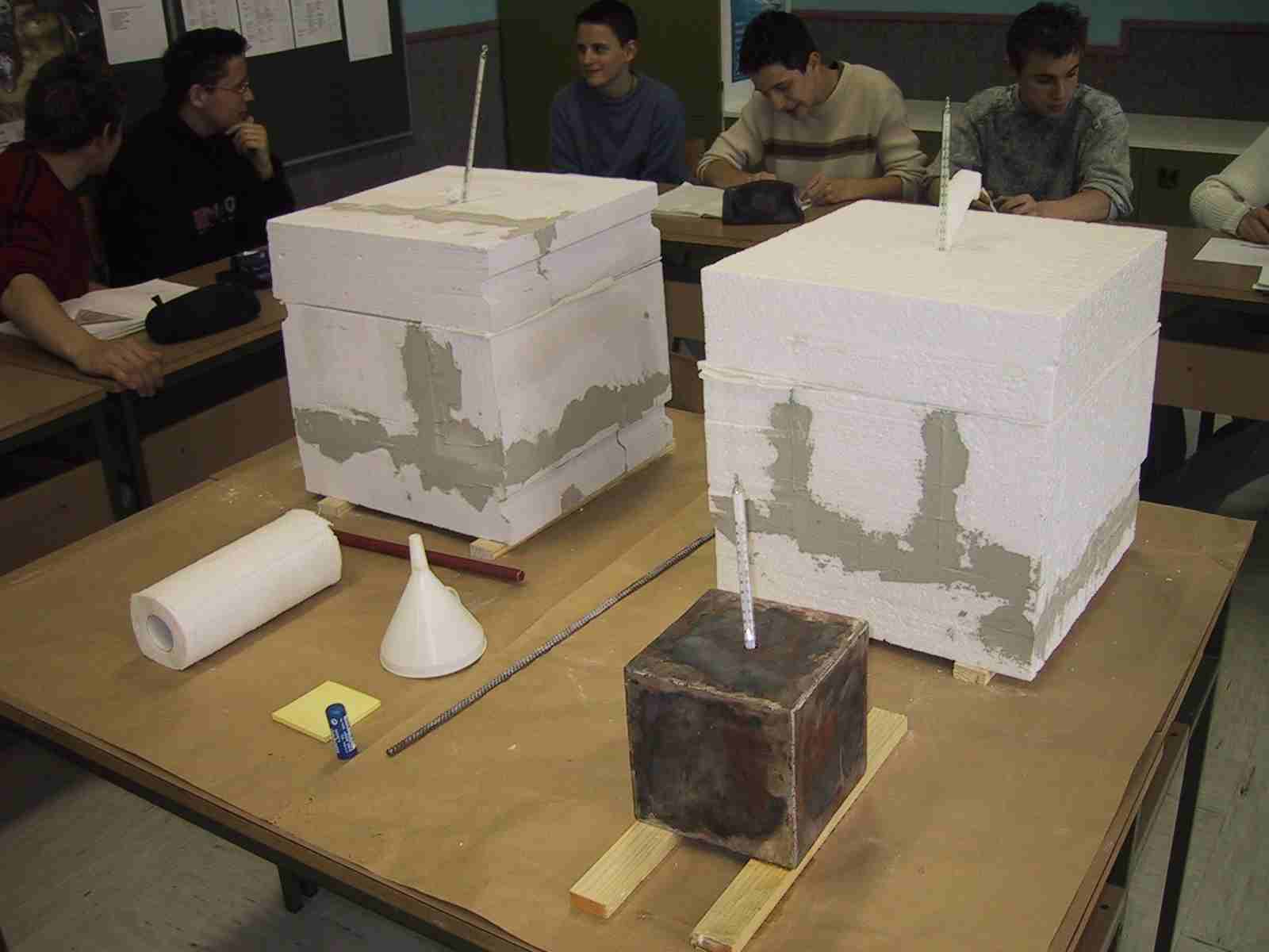 Tri pločevinaste posode v obliki kocke napolnimo z vročo vodo. Vodo izberemo zaradi visoke toplotne kapacitivnosti. Potem dve taki telesi izoliramo s stiroporom in siporeksom z debelino stene 10cm. Nato v časovnih presledkih merimo temperaturo vode v vseh treh posodah in podatke zapisujemo v tabelo. Temperatura okolice je 19°C.