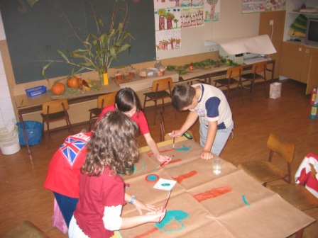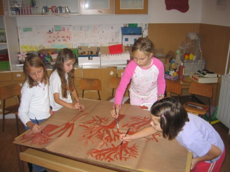Na velike kose papirja so učenci z vodenimi barvami naslikali sadovnjak, kot so ga videli v naravi.