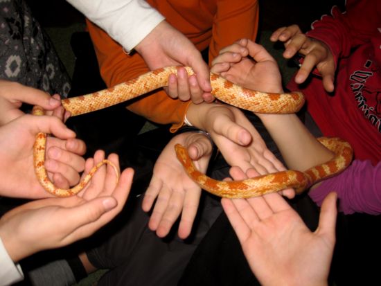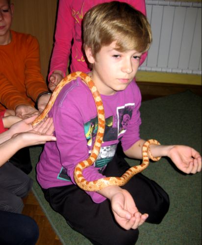 | Pisalo se je leto 2013. Mesec maj ... zelo vroče. Čisto po mojem okusu. In priselil sem se v 4. razred šole v Sp. Kungoti. Sem Arnold, ameriški rdeči gož. Popolnoma nenevaren. Moji lastniki so me poimenovali po junaku iz filma Terminator. 10 let sem bil njihov ljubljenček, potem pa so sklenili, da bodo otroci z menoj imeli večje veselje. Prav so imeli. Tako zelo me imajo radi, da mi včasih že preseda. No ja ... njihove tople drobne ročice ... mmm ... prijaaaaaa. So skrbni in pridno me hranijo. Z miškami. Slastne so! Pojedel bi tudi kaj drugega, ampak mi ne dajo. Enkrat je drugošolcem pobegnil hrček. Joj, ko bi le lahko prišel do njega ... Pa mi ni uspelo. Od takrat, ko sem nekajkrat pobegnil iz terarija so dosti bolj pazljivi. Sedaj mi nikakor več ne uspe odriniti steklenih vratc. |