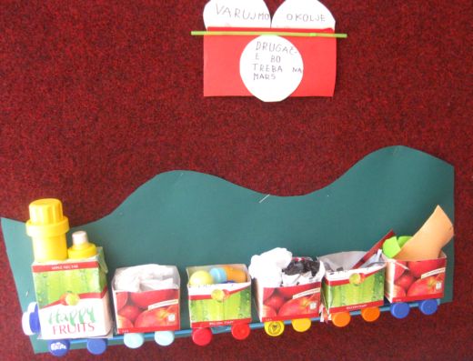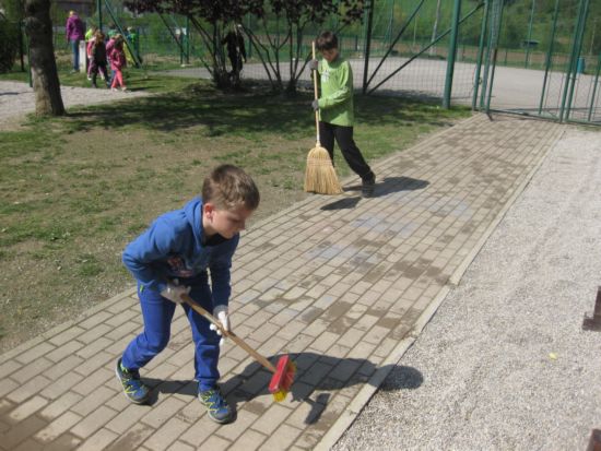Ustvarjali smo iz odpadkov in izvedli čistilno akcijo. Vsi učenci od 1. do 5. razreda so pridno čistili, pometali šolsko igrišče, dvorišče in šolsko okolico. Bili so tudi vrtnarji, uredili so gredice, s kompostnikom pognojili zeliščno gredico in vanjo zasadili nekatera nova zelišča, ki so jih prinesli.