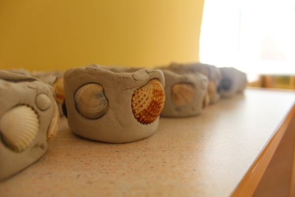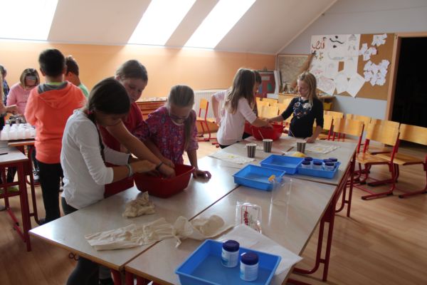 izdelki. Prvošolci in tretješolce so spretno gnetli, lepili, oblikovali