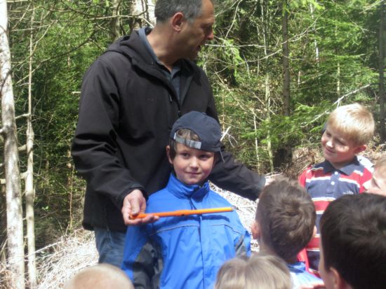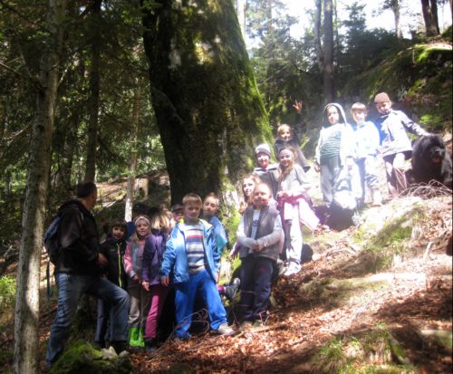 Drugo jutro nas je gozdar popeljal v gozd. Povedal nam je marsikaj zanimivega, pokazal veliko pripomočkov. Ob gozdarski hiši smo se preizkusili v žaganju, po strmini smo se povzpeli do bukve velikanke.