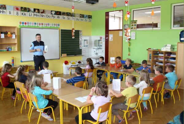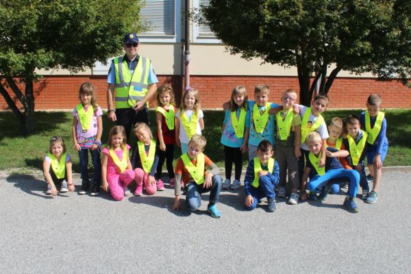 sijalo sonce, so prvošolci dobili pomemben obisk – policista Bernarda. Policist je učencem razdelil brošuro, s pomočjo katere jim je