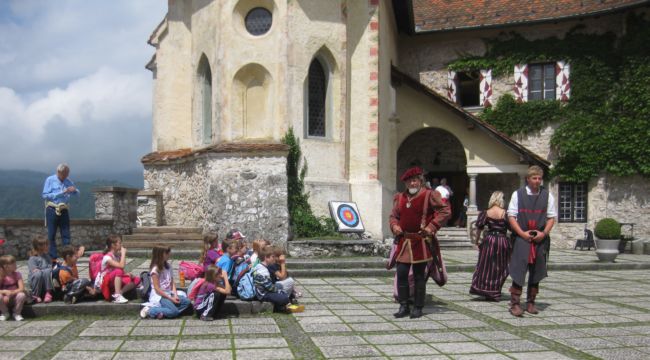 Najprej smo šli na grad na Bledu. Bilo mi je lepo. Deklice smo se morale vesti kot princeske, fantje so bili vitezi. Grof nas je odpeljal v muzej in nam tam razlagal. Grofica nam je obljubila, da bomo šli v kraljevo sobo, pa je pozabila. Bilo je veliko tujih turistov. Zdelo se mi je, da se vsi pogovarjajo o nas. Če bi imela zraven 100 evrov, bi si lahko kupila spominek v tiskarni.