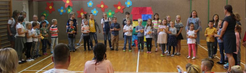 prvošolci skupaj z učiteljico Nado in svojimi pomočniki iz 5. razreda odšli v