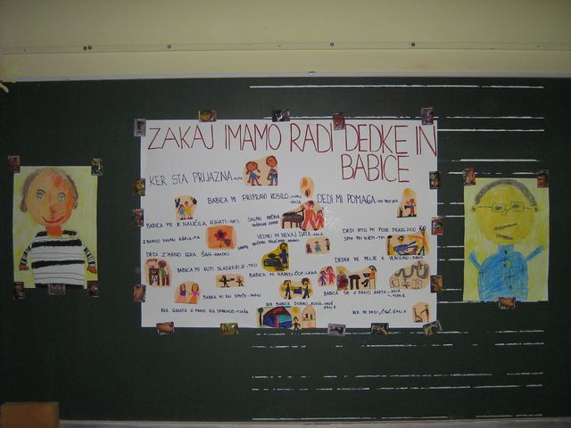 Danes je bil za učence 1. b razreda prav poseben dan, saj smo na razredno prireditev povabili dedke in babice. Prijetno smo bili presenečeni, kajti našemu povabilu so se odvali zares v velikem številu. Učenci so nestrpno pričakovali njihov prihod, ko pa so njihovi najdražji začeli prihajati v razred, je bilo res prijetno videti to veliko veselje in srečo pri vseh. Dopoldan smo jim polepšali s pesmicami, dramatizacijami, deklamacijami in plesi. Nekaj pesmic smo tudi skupaj zapeli. Pri občudovanju svojih vnučkov je imel marsikateri dedek in babica solzno oko. Ko pa so jim vnučki podarili majhno darilce, je bila sreča še večja. Naš dopoldan je minil zares v prijetnem in prisrčnem vzdušju.