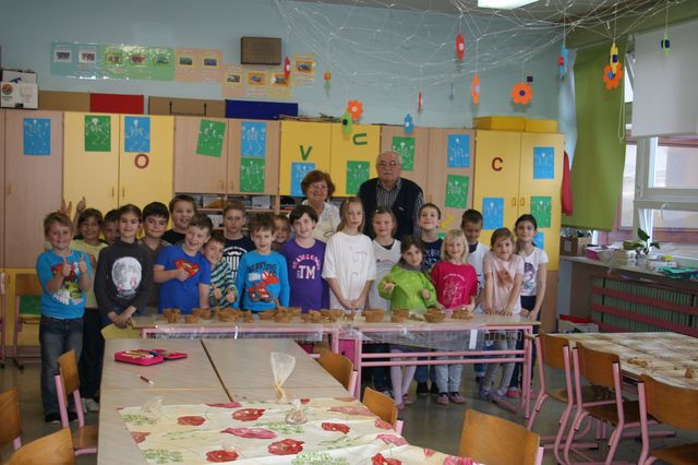 Obiskala nas je Kajina babica. Ljubiteljsko se ukvarja z oblikovanjem gline. Pripravlja tudi razstave. Zelo smo bili veseli, ko je sprejela vabilo, da nam pri uri likovne umetnosti pokaže svoje spretnosti. Za vse učence v razredu je prinesla glino in nam pokazala, kako ona oblikuje različne izdelke. Po njenih navodilih smo se tudi sami lotili oblikovanja. Pri delu smo zelo uživali.