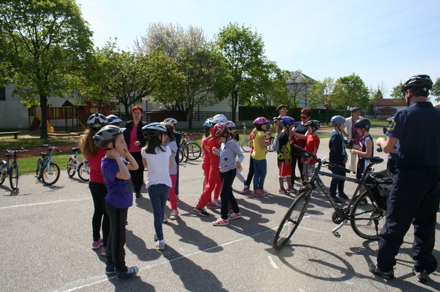 V sredo, 22. 4. 2015, smo učenci 3.a in 3.b razreda izvedli aktivnost, s katero želimo izboljšati prometno varnost v našem okolju. Učenci so pripeljali svoja kolesa in prinesli svoje čelade. Sodelovali smo s policistom Tomažem Trajbaričem, ki nam je najprej predstavil pravilno uporabo varnostne čelade in nas opozoril na pomembna pravila pri vožnji s kolesom. Na koncu pa smo izvedli še spretnostno vožnjo. Učenke višjih razredov so nam pripravile poligon. Nekateri učenci so bili pri premagovanju ovir poligona bolj uspešni, drugi pa malo manj. Za vse pa je bilo to prijetno doživetje, ki nam je popestrilo dan.
