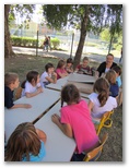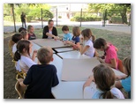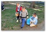 Na igralih so učenci v skupinah med drevesi in igrali reševali različne