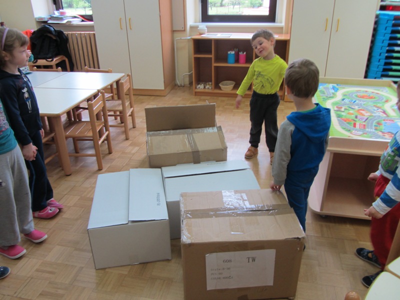 Nekega aprilskega jutra smo prišli v našo igralnico in ostali smo začudeni. Kar nismo morali dojeti kaj se je čez noč zgodilo z našimi igračami. Nekaj časa smo se samo pogledovali ter Mojco in Magdo spraševali kje so naše igrače. A natančnega odgovora nismo dobili. Lahko smo le ugibali, kdo nam jih je odnesel, kam nam jih je skril ter zakaj.Verjetno škrat. Na sredi igralnice pa smo zagledali kup kartonastih škatel, na policah časopisni papir, nekaj flomastrov in škarij, kamenčkov ter poučne knjige o polžih, ki smo se ravno takrat o njih učili ter jih opazovali in raziskovali. Čez čas pa smo »uporabili« domišljijo in naše škatle so se spremenile v vlak. Naredili smo si lokomotivo, vagone ter se v njih popeljali neznano kam. Vsaki dan smo si izmislili še kakšno novo igro, postalo nam je lepo in zanimivo in kar dva tedna smo preživeli z novimi »igračami«. Spoznali smo, da se lahko tudi iz odpadnega materiala lahko naredi čudovite stvari.