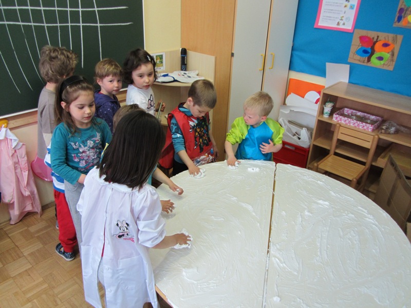 Pustil nam je tudi peno za britje s katero smo risali po mizah in ugotavljali kaj se z njo dogaja v naših rokah. Prijetno nam jo je bilo držati v rokah ter jo »špricati« med prsti.