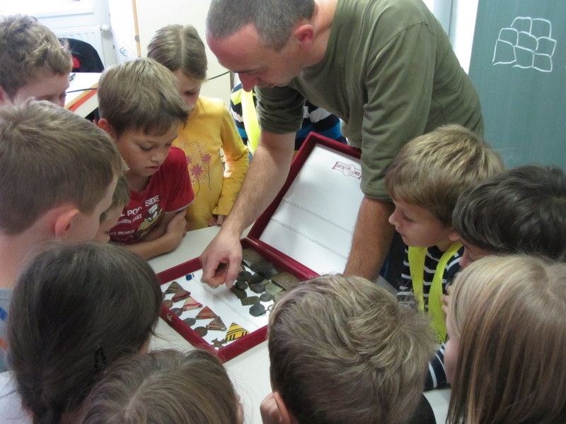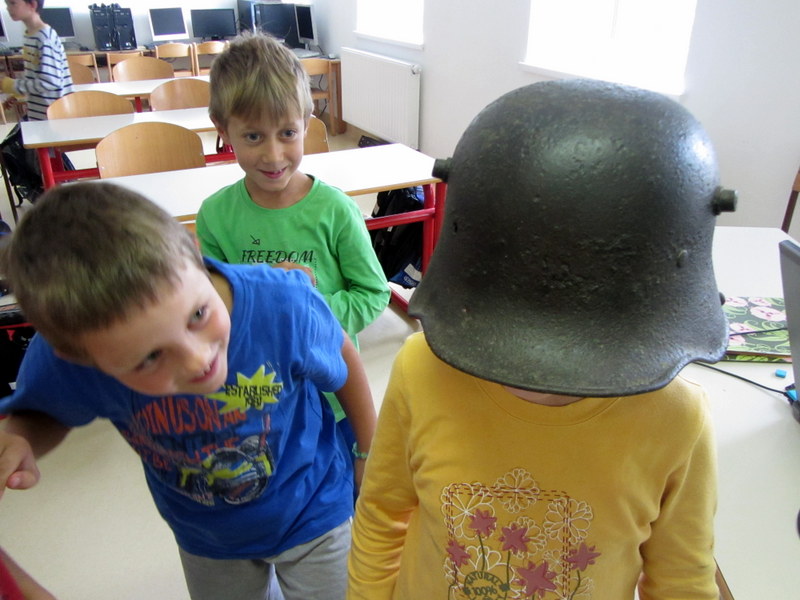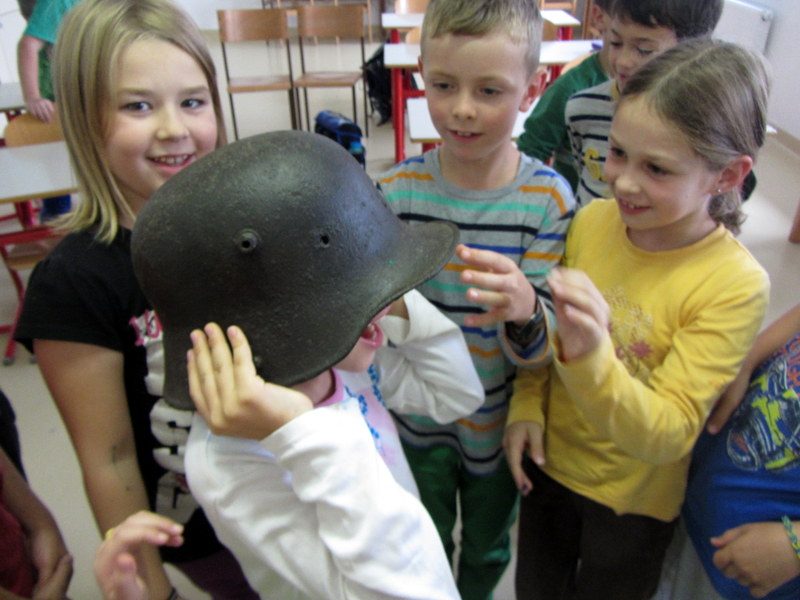 poslušali in spraševali, kar jih je zanimalo. Na koncu jim je pokazal še nekaj predmetov iz svoje zbirke. Še posebej jih je navdušila vojaška čelada, ki so si jo vsi poveznili na glavo. Po obisku so učenci uredili kotiček o 1. svetovni vojni, kjer so razstavljeni predmeti, ki so jih prinesli od doma.