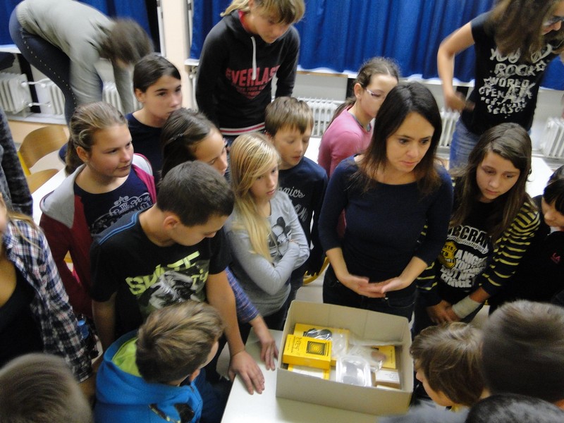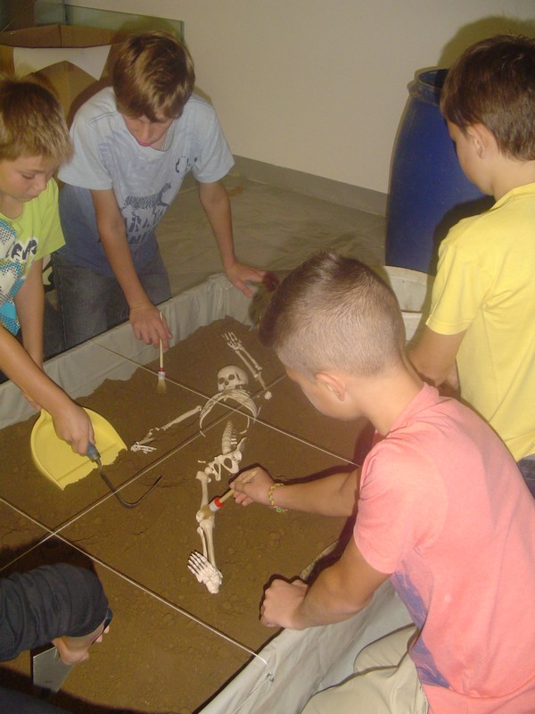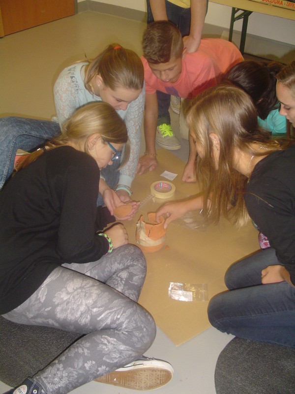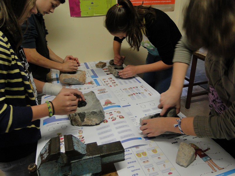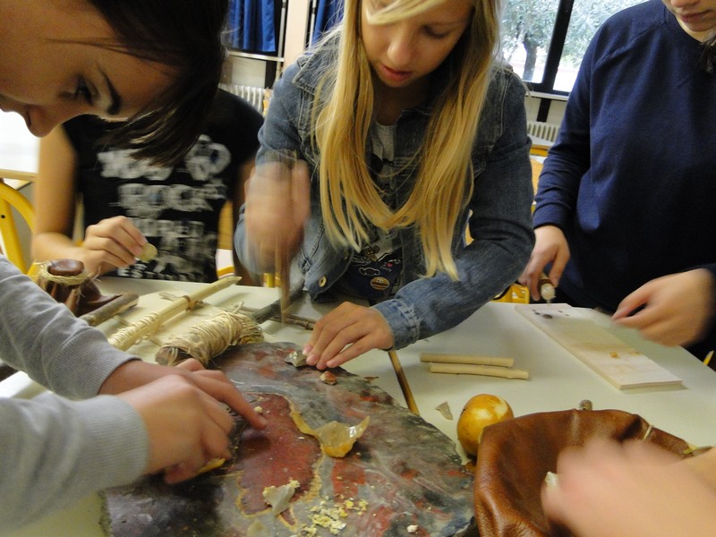 keramične  posode.  Obdelovanje gline v  posode pa je potekalo v  lončarski delavnici. Več aktivnosti je vzporedno potekalo tudi v prostorih šole. Tudi te so vodili strokovnjaki iz muzeja. Najprej nam je arheologinja predstavila prazgodovino in najdbe iz naših krajev. Nato smo se razdelili po delavnicah. Učenci v prvi delavnici so se učili delati vrv iz rastlinskih vlaken in živalske dlake. Druga delavnica je delila znanje, kako s kamnito žrmljo semena spremeniš v moko. Učenci so se učili tudi zanetiti ogenj zgolj s kremenom in suhim netivom s kresanjem ali z netilnim lokom.  V dejavnosti umetnosti v pradavnini so spoznali, kako lahko iz oglja in živalske masti narediš barvo s katero so učenci risali prave umetnine. V eni od delavnic je učiteljica predstavila več načinov uporabe kremena. Lahko so ga uporabili kot nož, strgalo ali žagico. V zadnji delavnici pa so se naučili delati okraske iz bakra kot je fibula. To naj bi bili prvi primerki nakita, ki so jih našli v naših krajih. Učenci so v vseh delavnicah zelo uživali.
