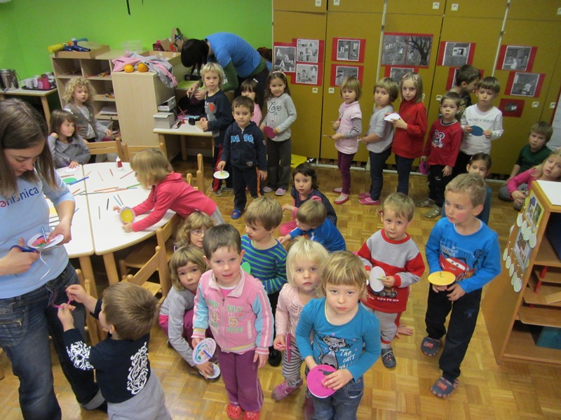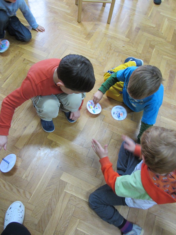 Slikarji in Junaki v Grgarju in Vrtnarji, Glasbeniki in Učenjaki smo v novembru medse sprejeli e – hišnici, Leo Kosmač in Andrejo Malus, kateri sta nas popeljali v svet eksperimentov. Z risanjem in lepljenjem ter s pomočjo barvice je nastala vrtavka, pri kateri smo ugotovili, da moramo biti kar spretni, da se ta dolgo časa vrti. Po večkratnih poizkusih smo vrtavke pospravili, sedaj pa jih spretno vrtimo še doma.