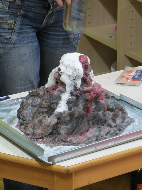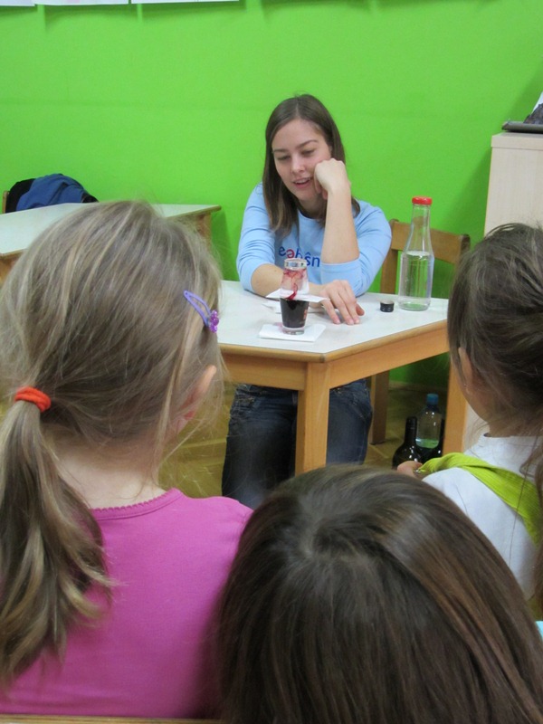 Ena izmed e – hišnic nam je kasneje prikazala eksperiment z vinom in vodo. Začudili smo se, ko se je list prilepil na poln kozarec vode in še bolj, ko sta se tekočini zamenjali. Skozi naše roke je nato potovala plastenka z modro vodo in oljem – ustvarjali smo val in se neučinkovito trudili premešati vsebino plastenke. Pred koncem obiska pa smo vse oči usmerili v gmoto na mizi, ki so jo prinesli iz e – Hišice in je prikazovala vulkan. In če se še vedno trudite ugotoviti postopek za delovanje vulkana, naj vam ga zaupamo: v večjo skodelico stresemo polovico zavojčka pecilnega praška, nanj vlijemo 0,5 dl detergenta in še drugo polovico praška ter zopet enako količino detergenta. Na koncu pa v skodelico vlijemo še 3 dl kisa za vlaganje. Počakamo sekundo ali dve in vulkan že bruha na plan.