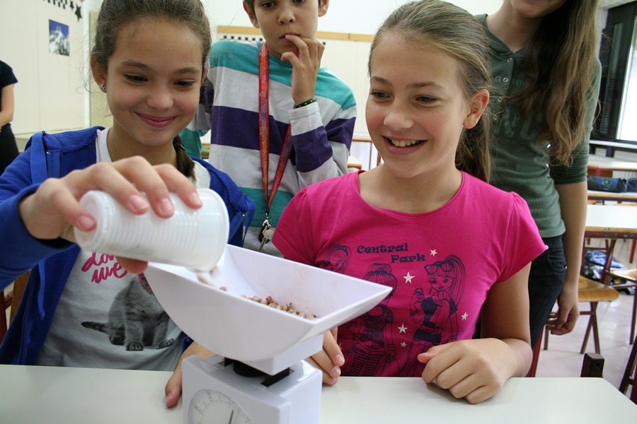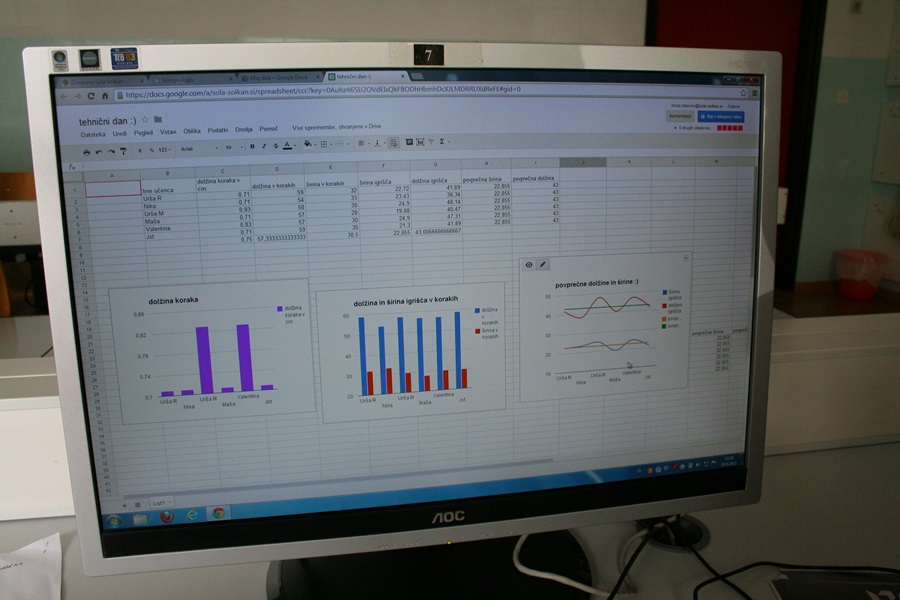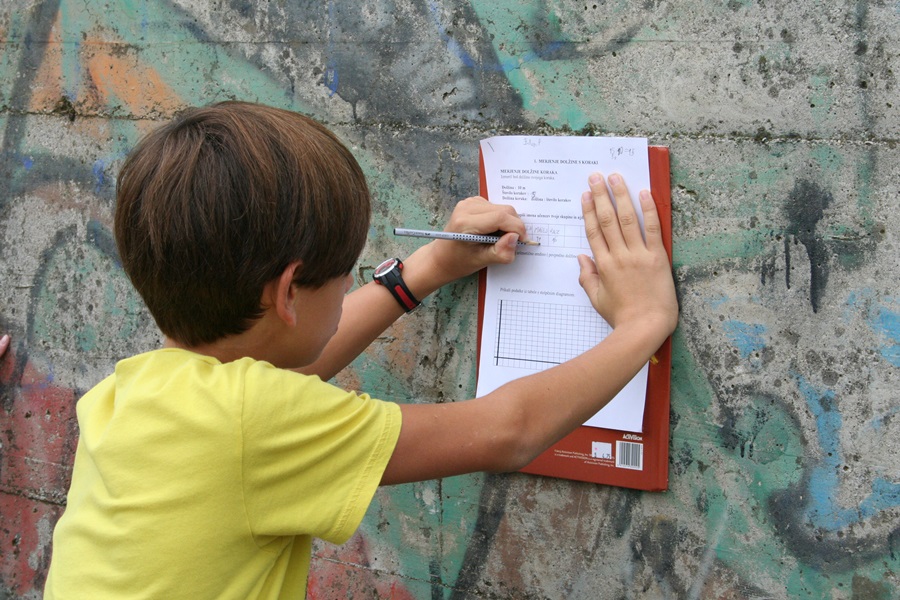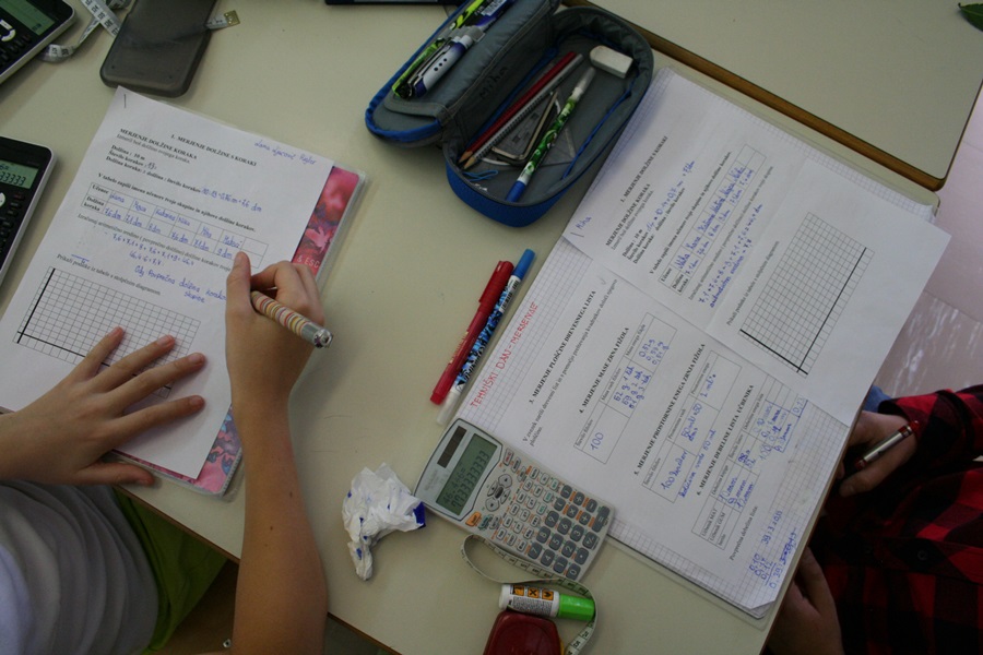 Meritve v praksi so bile prvi tehnični dan v septembru. Učenci 7. razredov smo nestrpno pričakovali nekoliko drugačen pouk. Ogledali smo si sezname, kako so nas razdelili v skupine in odšli po učilnicah, kjer so nam učitelji razložili, kaj bomo počeli pet šolskih ur. Preštevali smo fižole, jih tehtali ter ugotavljali težo enega fižola. Seveda nas je zanimal tudi volumen vseh fižolov in enega. Na milimeterski papir smo prerisali list različnih rastlin ter ugotovili ploščino drevesnega lista.S koraki smo izmerili še dolžino in širino nogometnega igrišča, izračunali poprečje korakov v posameznih skupinah. Vse meritve smo prenesli v stolpične diagrame. Nekateri so si pomagali tudi z računalnikom.