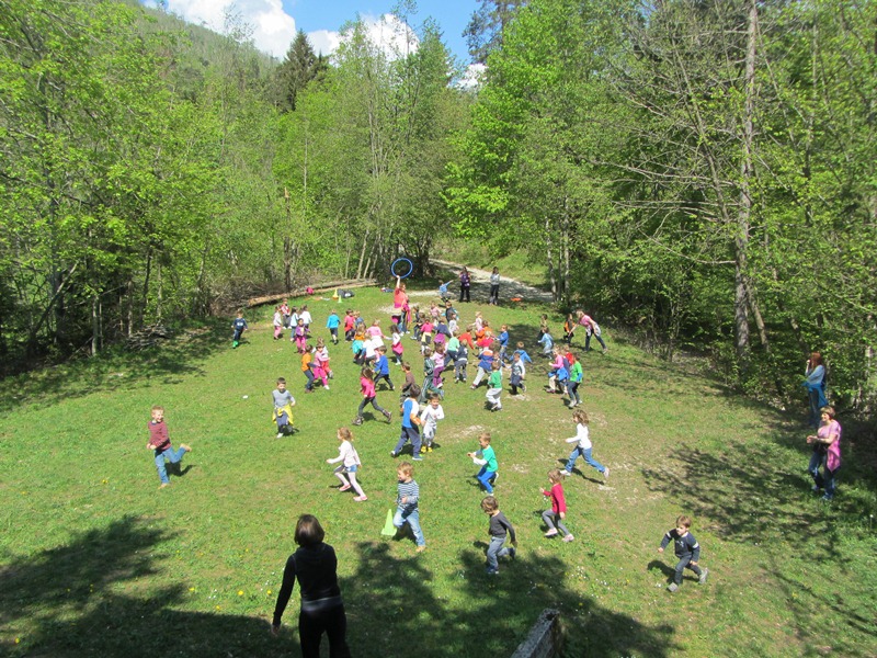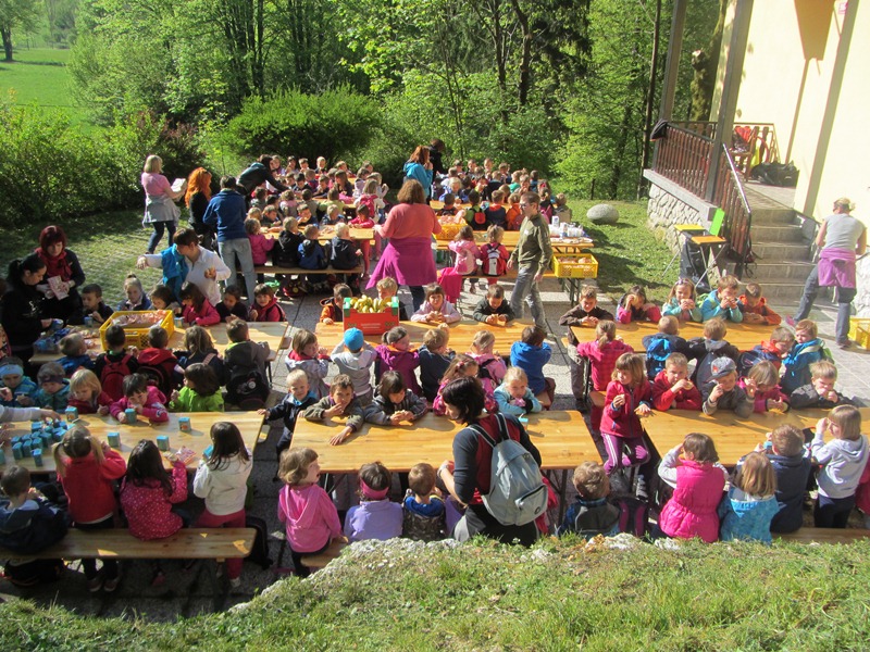 Kot se za nagrado spodobi, smo se v petek, 25. aprila, po še enem uspešnem koncertu, odpravili v Čepovan, ki je bil ta dan obsijan s soncem. Otroci vseh treh enot smo se najprej ustavili pred Medgeneracijskim domom Čepovan, kjer smo imeli prav posebno malico, kar zunaj.
