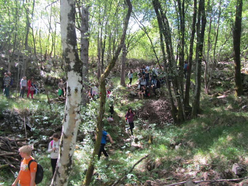 Tako razdeljeni smo krenili po proti Cerju, kjer smo tudi pomalicali. Znotraj stolpa na Cerju smo si ogledali kopijo brižinskega spomenika ter raztavo o 1. svetovni vojni. Čisto na vrhu smo se lahko še razgledali, saj je razgled segel od morja do Triglava. Vsi skupaj smo se nato odpravili do Borojevićevega stola in do 70% naravne jame, ki je med vojno služila kot zaklonišče. Za konec smo si ogledali še italijanski topniški položaj, kjer smo se od Konrada poslovili ter se odpravili nazaj na parkirišče. Vsi smo se zamislili nad grozotami in pustošenjem prve svetovne vojne od katere prav v letošnjem letu mineva že sto let.