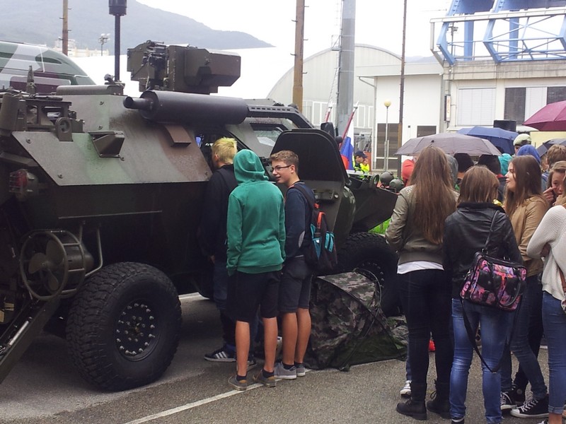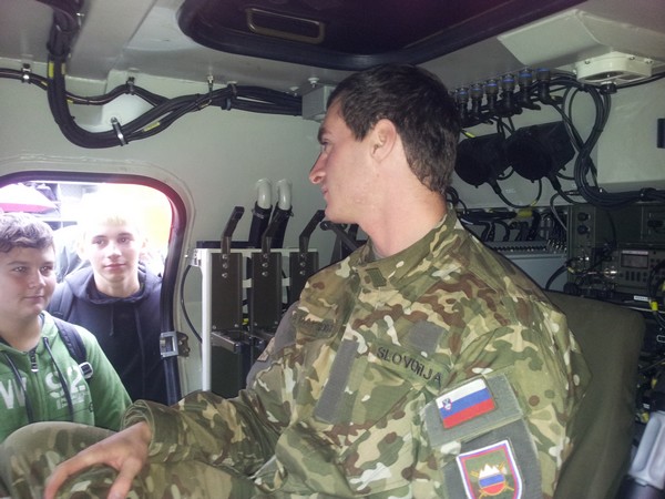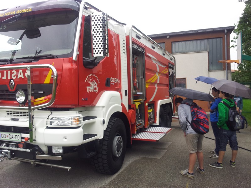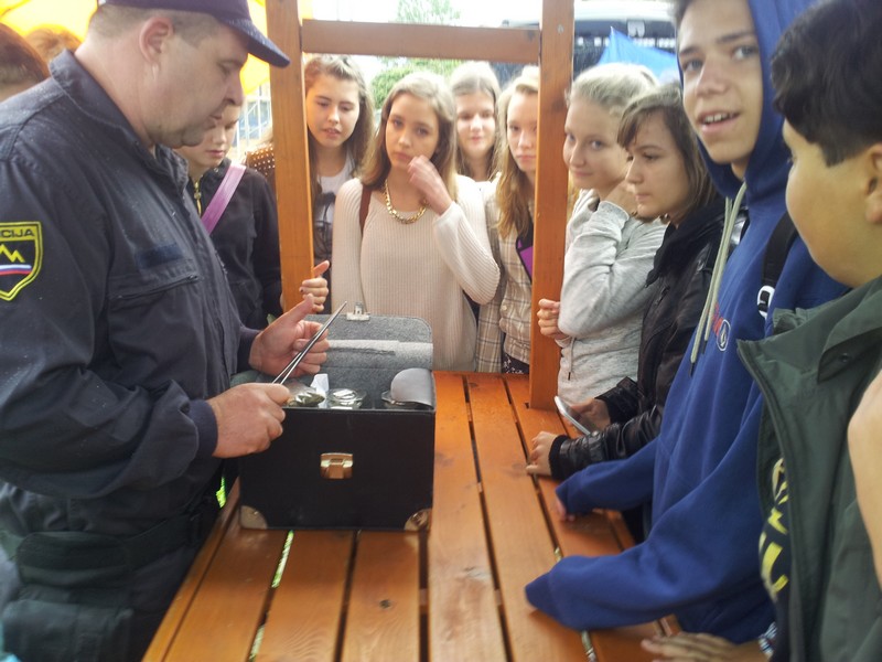 gasilci pokazali nekaj primerov intervencij, npr. v primeru razlitja nevarnih snovi, vžiga plinske jeklenke, gorenja olja… Povedali so nam tudi, kaj moramo mi storiti v takih primerih. Čez nekaj časa, smo si ogledali še prikaz reševanja z visokih objektov (v tem primeru so se reševalci z vrvjo spustili z reflektorja na stadionu) in vojaško vozilo-KOBRO, sodobna gasilska vozila ter nekaj drugih vojaških pripomočkov. Našemu razredu so reševalci iz rdečega križa prikazali še oživljanja in nam predstavili poseben šotor za reševanje, medtem ko so si drugi učenci ogledali delo službenih psov, ki pomagajo vojski in policiji pri obvladanju nasilnežev in iskanju drog in eksploziva. Vse skupaj je bilo zelo zanimivo in ob vsem smo si lahko priznali, kako dobro usposobljene so naše varnostne sile, ki nam stojijo ob strani v naravnih in drugih nesrečah. Za kratek čas smo si lahko ogledali še tekmovanje v poslušnosti reševalnih psov, na katerem je sodelovalo skoraj 20 držav iz vseh koncev sveta. Ob odhodu smo se posladkali še s domačim piškotom in jabolko, ki smo jih dobili na stojnicah, tako da smo lažje odkorakali proti šoli.