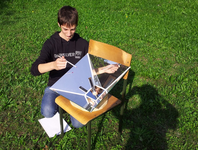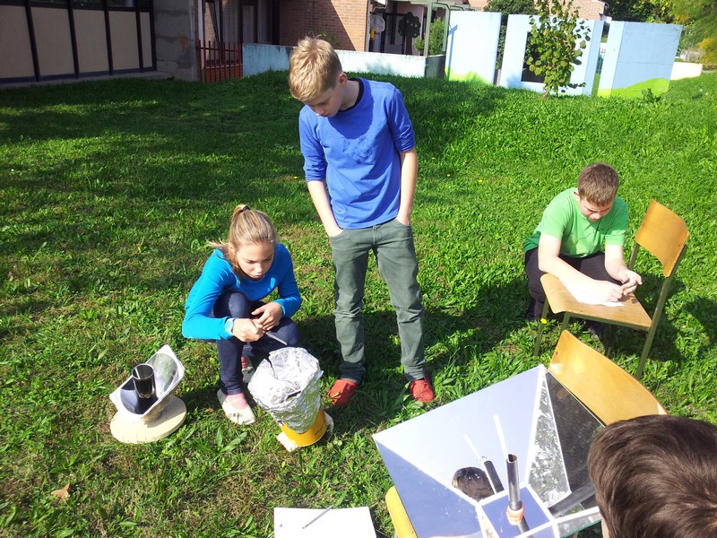 OBD_1Pri izbirnemu predmetu DALJNOGLEDI IN PLANETI smo izdelovali sončne peči  po lastnih idejah in iz odpadnih gradiv. Te peči naj bi ujele čim več sončnih žarkov in jih usmerile v fokusno točko, kjer se je nahajal zbiralnik vode. Zelo izvirni izdelki, ki so nastali po zamislih učencev so potrdili hipotezo,..... da na tak način lahko v krajšem času segrejemo vodo kar za nekaj stopinj. Za izdelke so učenci porabili: odpadne embalaže mleka, aluminijaste posode, zrcalo, avtomobilski žaromet in še druge materiale za izdelavo ohišja. Na slikah si lahko ogledate nekaj izdelkov in učence pri meritvah.