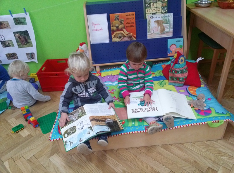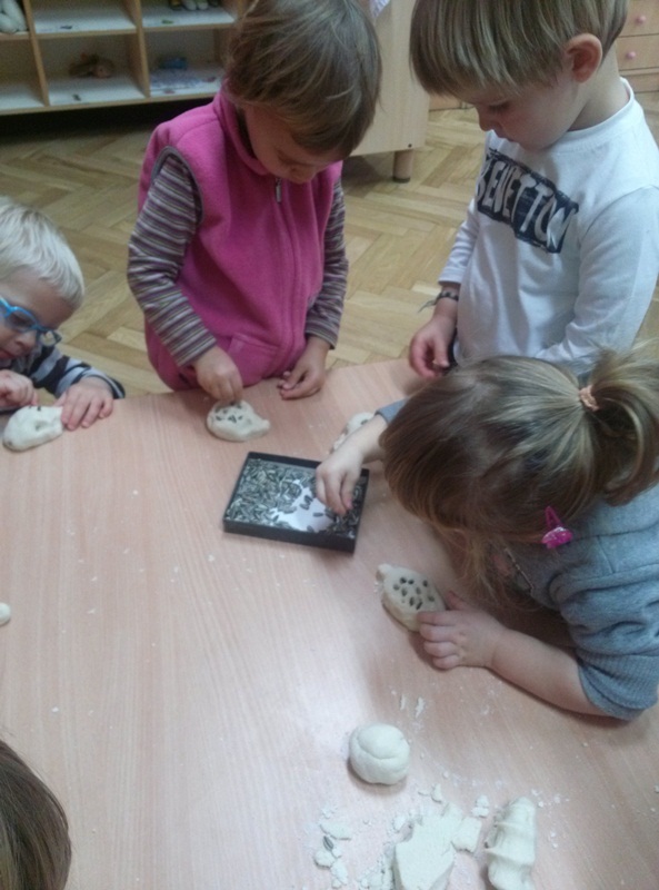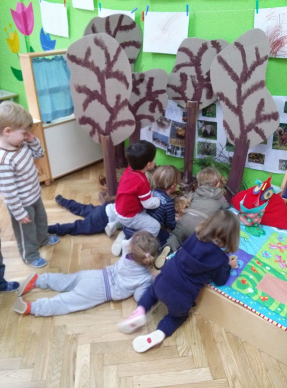 Čarobnost jesenskega časa smo si skupaj z otroki prenesli v našo igralnico; izdelali smo si čisto pravi gozd z jesenskim listjem, plodovi in ježkovim brlogom. V posebno veselje nam je bilo gnetenje slanega testa in oblikovanje ježkov. Tudi ostale gozdne živali smo spoznavali z izdelovanjem plakata in opazovanjem knjig.