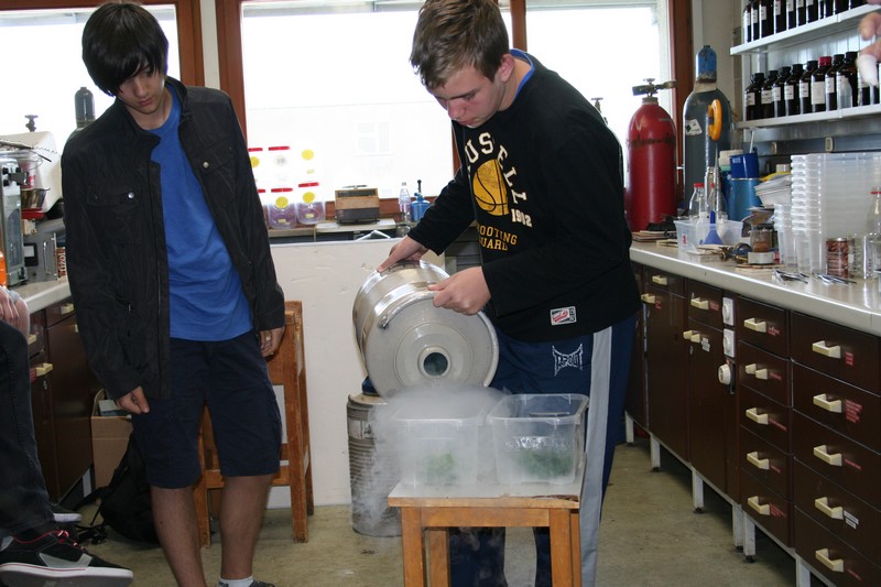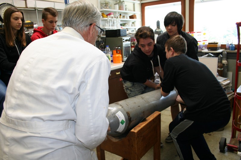 gospod Peter, ki nam je dokazal, da je s steklom zelo spreten – za spomin nam je izdelal laboda. Za tem nas je gospod mag. kemije, Tomaž Ogrin, odpeljal k postaji za tekoči dušik, kjer smo izvedli nekaj poskusov z dušikom (gašenje, zamrzovanje). Poskuse z ostalimi plini smo nadaljevali v kemijskem laboratoriju inštituta. Zamrznili smo liste dreves, izdelali suhi led, opazovali krčenje plinov zraka v balonu, vdihavali helij in smejalni plin. Po zelo zanimivem dopoldnevu smo se odpravili k Reaktorskemu centru v Podgorici, kjer nam je gospod Tomaž Skobe predstavil delovanje jedrske elektrarne Krško. Po predstavitvi smo si ogledali poskus sevanja radona. Nato je sledil ogled razstave raznih maket, ki so predstavljale delovanje jedrske elektrarne Krško – med njimi gorivni element in kontrolna soba. S tem se je naš zanimiv in pester dan zaključil. Domov smo prišil prijetno utrujeni ter polni novega znanja.Pripravili učenki: Bernarda Rusjan in Gaja Okretič Kogoj