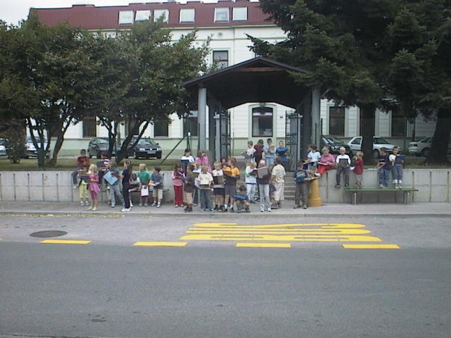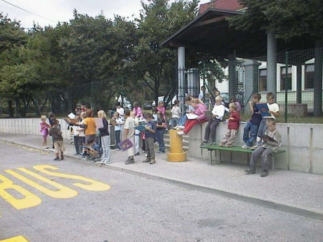 kraj A, smo izbrali avtobusno postajo pred šolo. Ker ulica pred šolo