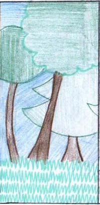 There are many big trees and beautiful flowers in the forest and the birds are singing.