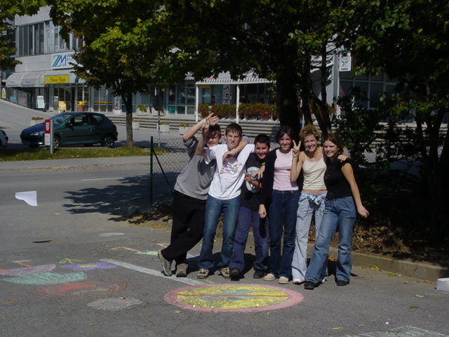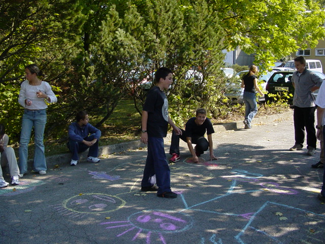 V ponedeljek smo učenci 8.b razreda popestrili naše ure likovnega pouka.Odločili smo se, da tudi mi sodelujemo pri aktivnostih ob dnevu >v mestu brez avtomobila <. Z barvnimi kredami smo porisali dvorišče naše šole. Želimo sporočiti, da se učenci ne počutimo varni na cestah, ki so prenapolnjene z drvečimi avtomobili in da si želimo tudi varen, nam bližji, z zebro označen prehod čez cesto, ko tečemo domov, na avtobus.