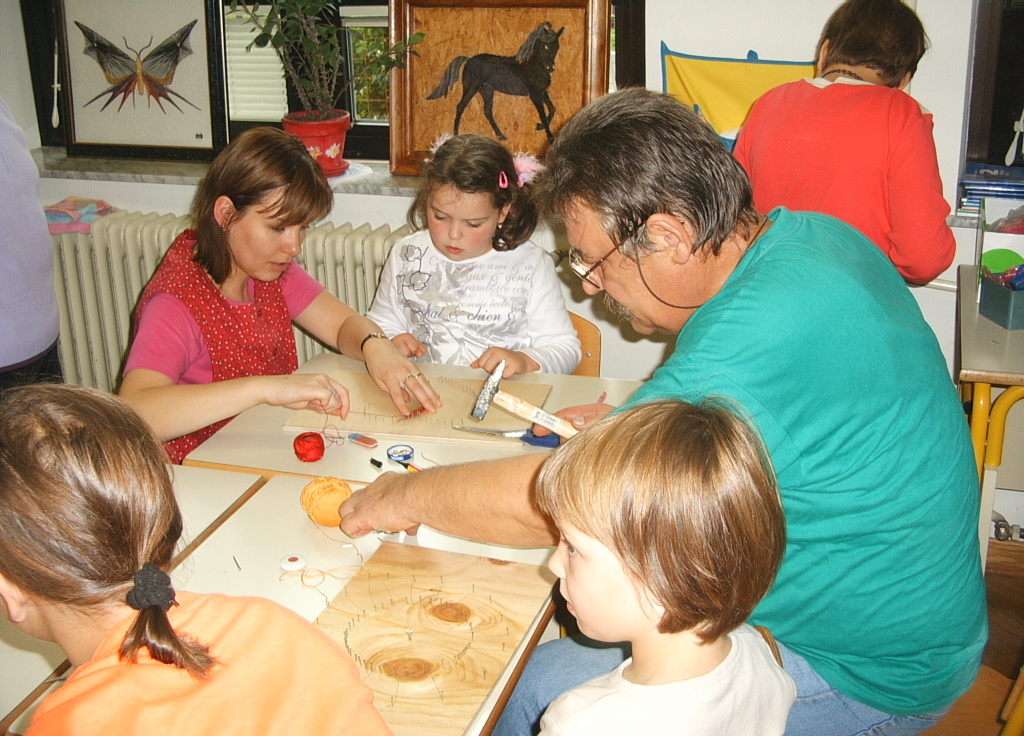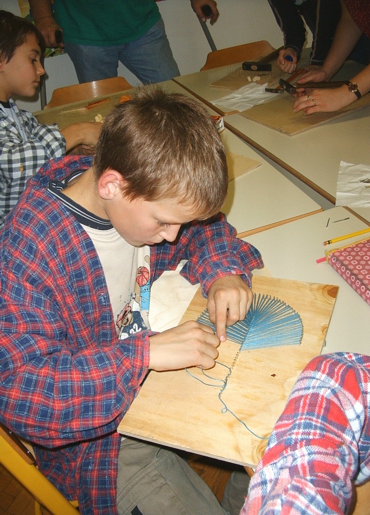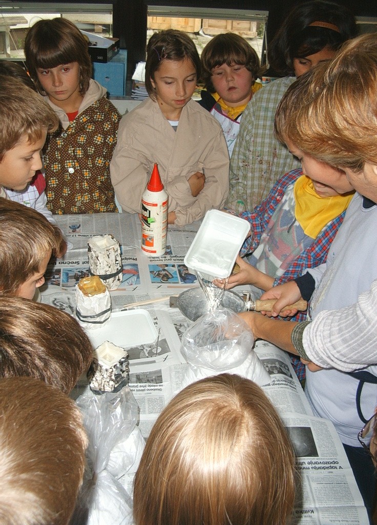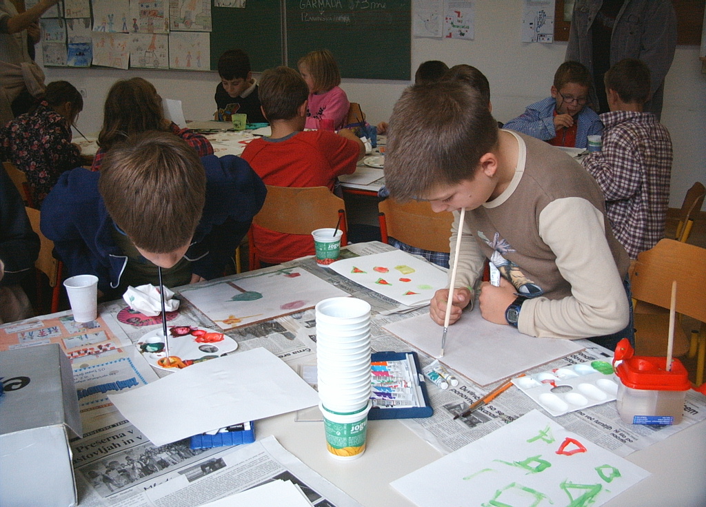 Problematika vključevanja gibalno oviranih v današnji družbi : dopoldanske likovne delavnice so potekali z Benjaminom Žnidaršičem-tetraplegikom-pesnikom in slikarjem, ki slika z usti, Jožetom Tomažičem, ki nas je seznanil s filografijo, s slikarjem Rajkom Čauševičem smo spoznavali osnove oljne tehnike, z gospo Dragico Čadež pa smo ulivali kipce Prešerna in Cankarja v kalupe. K ustvarjalnim delavnicam so se priključili vsi učenci Podružnične šole Laze z učiteljicama Bojano in Karmen.