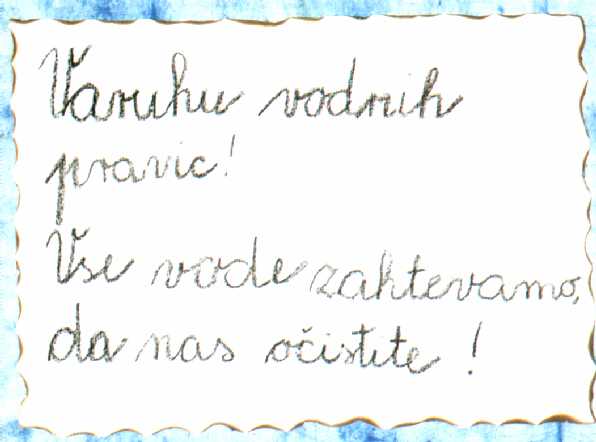 »Čeprav je naša sorodnica, gospa Morska voda, veliko večja kot me, Sladke vode, se mora tudi ona spopadati s podobnimi težavami. A ker nas je tako malo, je tudi naša ogroženost toliko večja. Zdaj pa vabim vse predstavnike, da po svoji velikosti poročajo o onesnaženosti.«