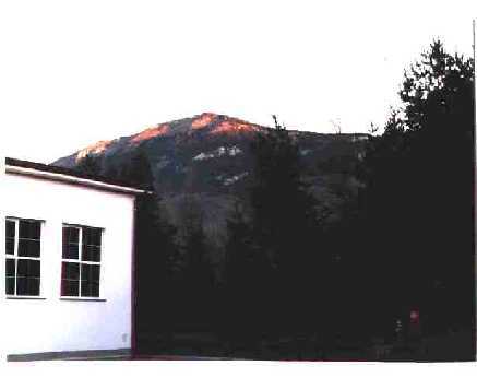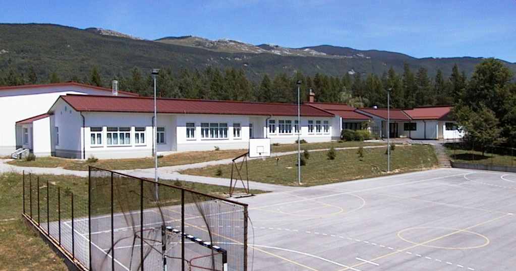 . Logotip šole - delo učencev pa je ostal nespremenjen. Nad šolo se dviguje hrib (gora)