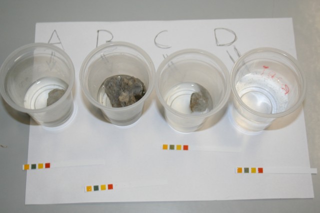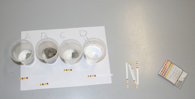 Delo: Čaše označi s črkami od A do D. V vsako čašo natoči do polovice z destilirano vodo. V čaše A, B in C daj vzorce kamnin. V čaši D naj bo samo destilirana voda. Čaše pokrij. Vse skupaj pusti stati 14 dni. Po 14 dneh izmeri pH.