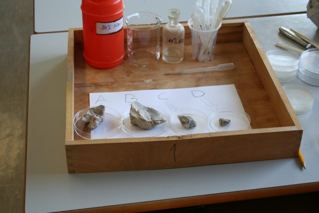 - Kemikalije: vzorci kamnin, 11% HCl, 20% HCl.