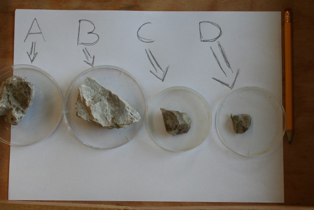 Delo: Pripravi štiri vzorce kamnine, za katere predvidevaš, da so iz dolomita. Vzorce označi s črkami od A do D. Na vsak vzorec kani kapljico 11% HCl in opazuj, kaj se dogaja. Vzorce speri ter poskus ponovi z 20% HCl. Rezultate zapiši v tabelo. Na koncu poskus ponovi še z večjim vzorcem kamnine.