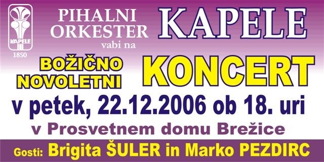 - 22. december 2006 ob 18. uri: BOŽIČNO-NOVOLETNI KONCERT Pihalnega orkestra Kapele v Prosvetnem domu v Brežicah.