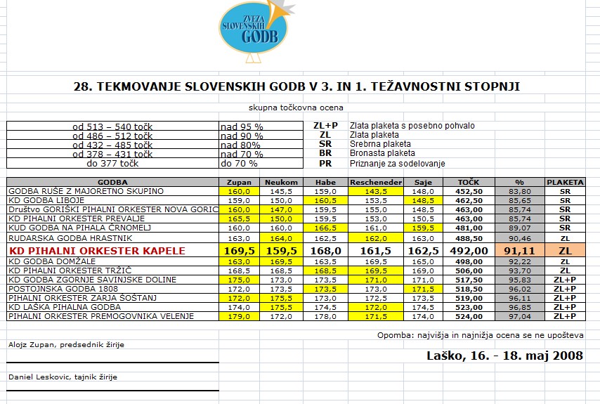 18. maj 2008 - REZULTATI S TEKMOVANJA...... ODLIČNO NA 28. TEKMOVANJU SLOVENSKIH GODB V 1. TEŽAVNOSTNI STOPNJI - ZLATA PLAKETA JE v KAPELAH... članek + SLIKA s tekmovanja