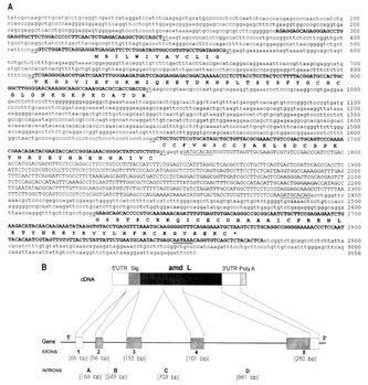 | Fig.1 Complete nucleotide sequence (A) and the structure (B) of the ammodytin L gene. The deduced amino acid sequence is presented below the coding parts of the exons. Splicing signals, signal for polyadenylation and direct repeats are underlined, exons are in bold capitals. Introns and both flanking regions are designated by small letters. Truncated Bov-B LINE, previously designated as ART-2 retroposon and positioned between direct repeats, is designated by capitals. The structure of the ammodytin L gene is compared with its cDNA. Five exons are indicated by boxes, the four introns and both flanking regions by lines. |