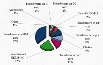 We are preparing a new planar cores for the telecommunications field which will be installed directly onto printed circuits board, where it will already be a part of the coil. This type of transformer will be used to feed individual electronic complexes. Central supply to telephone exchanges will be divided among individual complexes. Voltage will be reduced to 5V, 3V or even 1.8V. Dissipation into integrated circuits will be decreased at these voltages, there will be less interference and product lifetime will be extended.
