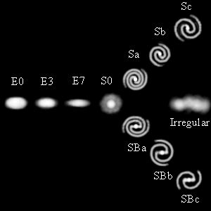 Delitev galaksij v različne razrede. V desno smer vidimo (iregularne) nepravilne galaksije, ki nimajo nobene posebne oblike. Na levo so kroglaste galaksije, ki po svoji obliki še najbolj spominjajo na krogle ali elipsoide. Na poąevnih linijah pa so ostale ąe spiralne galaksije, pri čemer imajo spodnje prečko, zgornje je pa nimajo. |